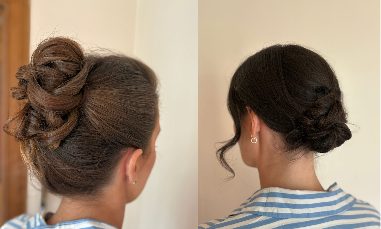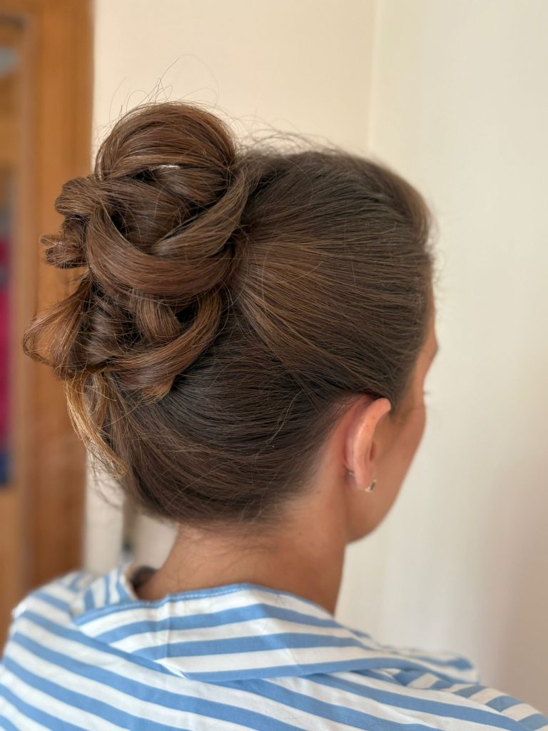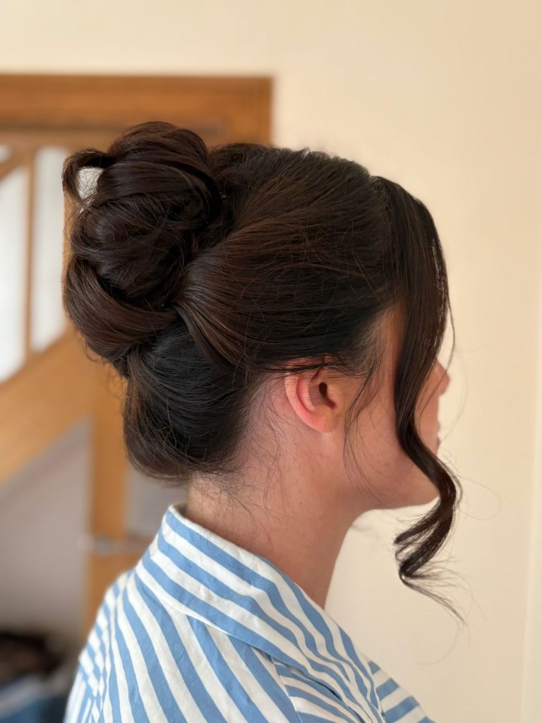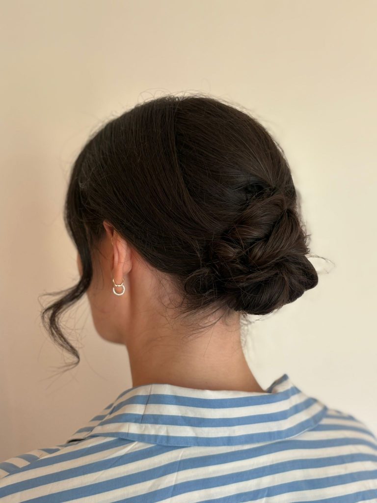 A modern update on the French roll, this version sits higher on the head, with relaxed texture and a softer shape. The structure is there, but the overall finish is more lived-in than set. The front is kept loose and natural, with movement through the crown to avoid any sense of rigidity.