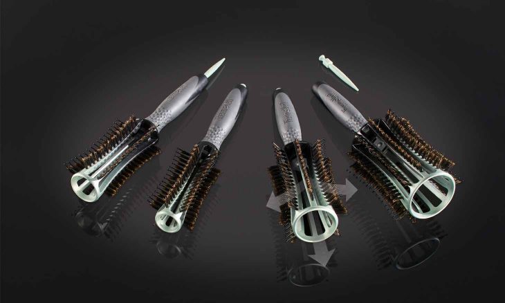 The patented one-piece ventilated barrel design creates superior airflow to drastically reduce drying time and avoid damage from over-drying. With a scalp-hugging barrel and full ventilation throughout, stylists can use heat and cool shots inside of the brush head to seal in a better and longer-lasting shape. A unique bristle combination of alternating rows of natural boar and ionic bristles allow for perfect tension control and eliminate frizz and flyaways, working especially well on textured hair. Whether creating volume or straightening hair, the anti-static bristles hydrate the cuticle and add shine. Each brush also has a non-slip rubber handle perfectly shaped to easily rotate the ultra-lightweight and durable tool, along with a retractable sectioning pick.